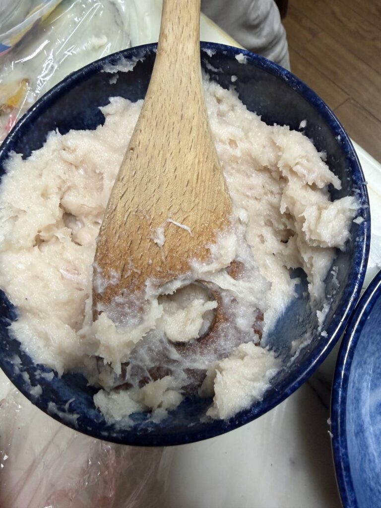 さて、早速すり身のやり方を検索してさつま揚げの作り方を調べました。フードプロセッサーですり身にして調味料やはんぺんも入れて練り上げました。お吸い物用に小さなダンゴにしたものと、紅生姜やもやしを加えて練り上げ小判型に成形をしたものを作りました。