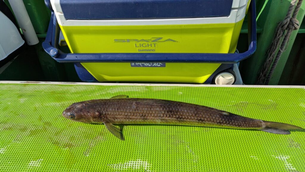 これはいけるとばかりに同じようにラインの角度に気を配りながら100gのジグをキレのあるワンピッチジャークで続けているとまたしても中層でヒット。今回はサイズダウンかなといった感じで大した手ごたえもないままにネットインしたものは、なんとお邪魔な存在のエソくん。しかも馬鹿でかく太い。なんだよ、エソかよって思っていると後ろにいたアングラーから、 ”それ美味しいですよ” の囁きが。 ”すり身にしてさつま揚げにしたら最高ですよ。” とのおい囁き。 ということで確保。