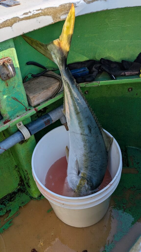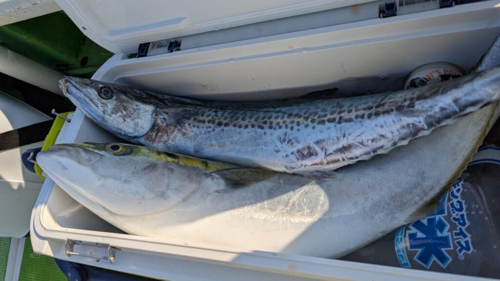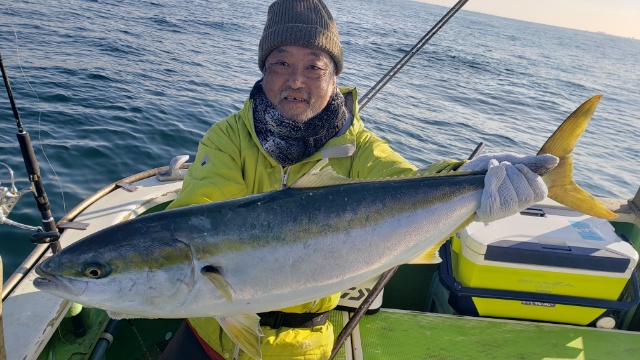 その後はいろいろ工夫を凝らしながらしゃくり続けたのですが、後が続かず。 キスのようなエソが2本追加。いつも感じていますが、私、中だるみがやって来るのです。いつも、最初は何とか釣れているのですが途中からまったく釣れない時間がやって来るのです。頑張れば頑張るほど釣れないんです。焦りなのか殺気が立つのか、みんなは釣れているのにいったいどうすればいいのか、考えれば考えるほど頭の中がごちゃごちゃになってきます。 やばいです、もう少しで沖上がりの時間です。 何とかしなければ、そうだ、自分の最初の考えに戻ろう、100gのジグで、斜め引きに徹してみよう。そう気を取り直してしばらくリズミカルなワンピッチジャークを続けていると、根掛りのようなアタリ。と、共にドラグがジージーと出ていきます。これはでかいと本能的な感覚に、慎重かつ丁寧なやり取りに切り替えて対処。何度か突っ込まれたが耐えること数回、ほどなくしてネットイン。 でかい!ブリだあ~(実はワラサクラス) 家に帰っての実測で5kgオーバーの巨漢でした。(これではワラサと呼ぶしかないな~) やりました。 久しぶりの青物とのファイト、両腕がわなわなふるえます。血抜き、脳〆も行ってしっかり氷付けにして帰宅。